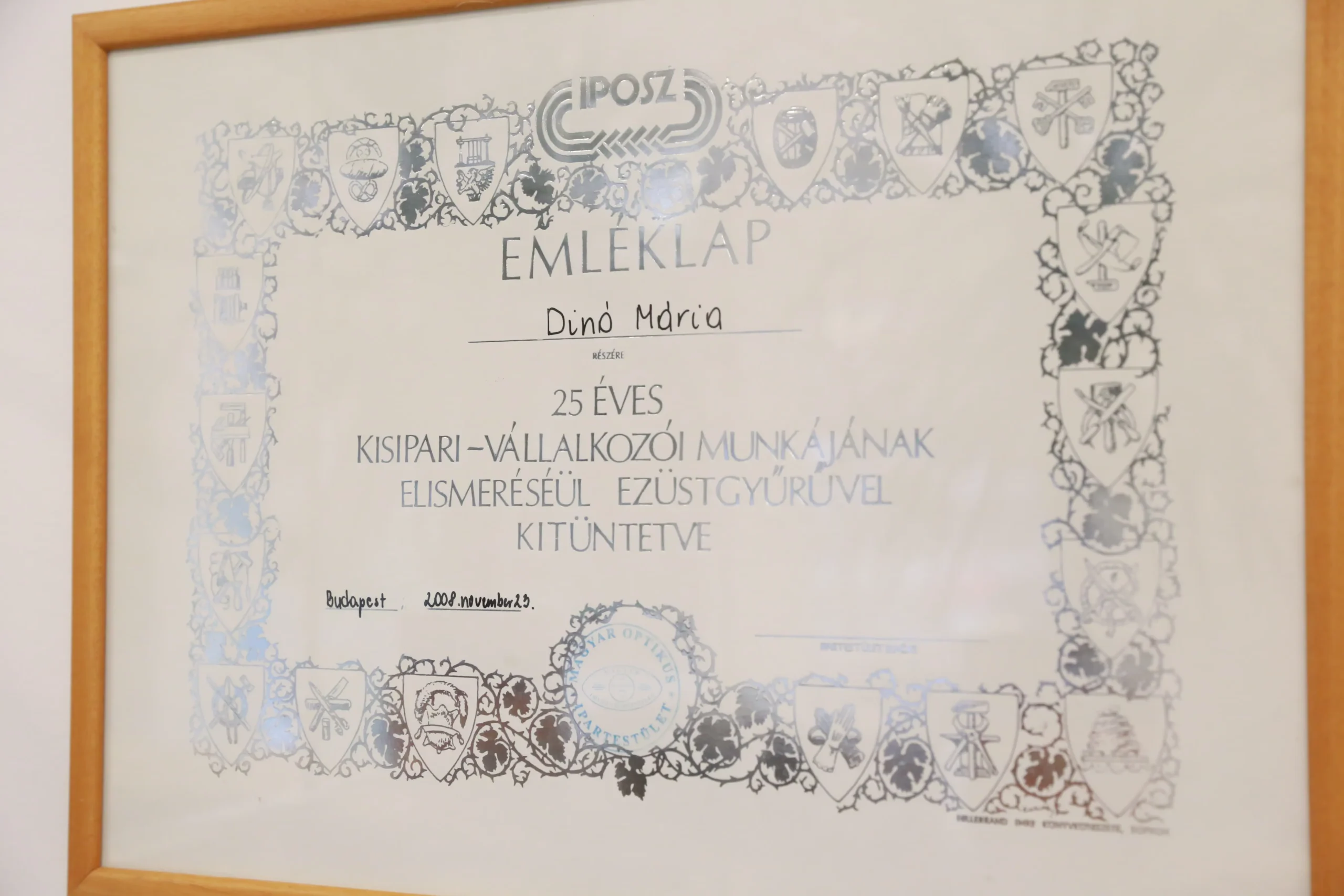 Dinó Mária egy név a szakmában, nem hiába: 50 éves szakmai tapasztalata és a szakma iránti elhivatottsága a személyiségének alapvető része. 1972-ben végzett látszerész- és fotó-optikai cikk kiskereskedőként, ezt követően a régi Ofotért üzletben helyezkedett el műhelyesként. 1980-ban tette le a mestervizsgát, nem sokkal később pedig megnyitotta a Dinó Optikát. 1989-ben az éppen megalakuló Látszerész Ipartestület alapító tagja volt, azóta pedig több szakmai elismerésben is részesült. 2020-ban adta át az optika vezetését fiának, Keidl Márton látszerésznek, de ma is aktívan részt vesz az üzlet működtetésében.